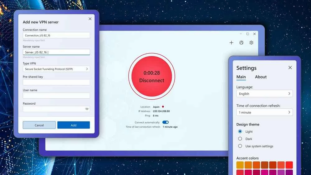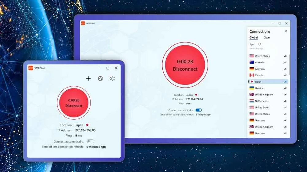عميل VPN لنظام Windows هو أداة فعّالة لإدارة أنشطتك على الإنترنت مع تشفير بياناتك. يُخفي عنوان IP الحقيقي الخاص بك ، ويتيح لك تصفحًا سلسًا أثناء اختيار خادمك المفضل. يمكنك استخدامه مجانًا، أو شراء اشتراك للحصول على ميزات إضافية.